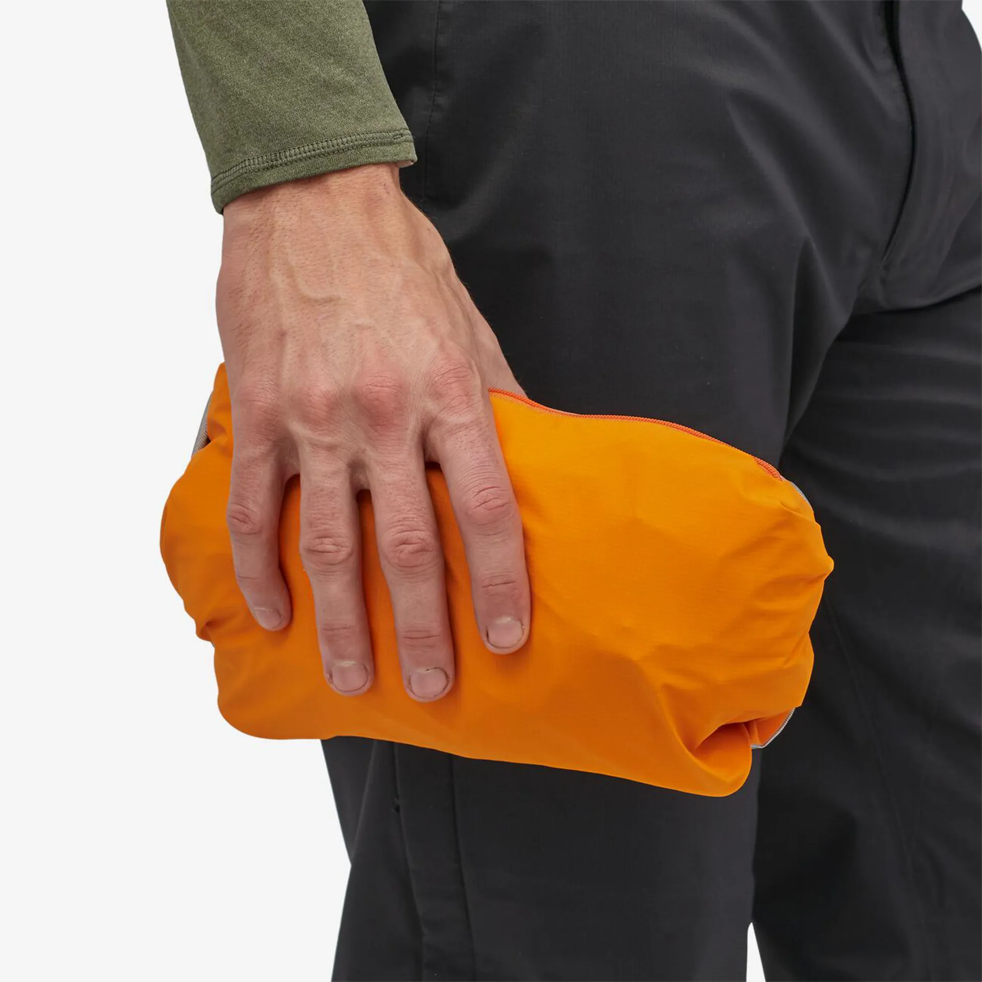 Self-stuffs into left-front pocket with carabiner clip-in loop