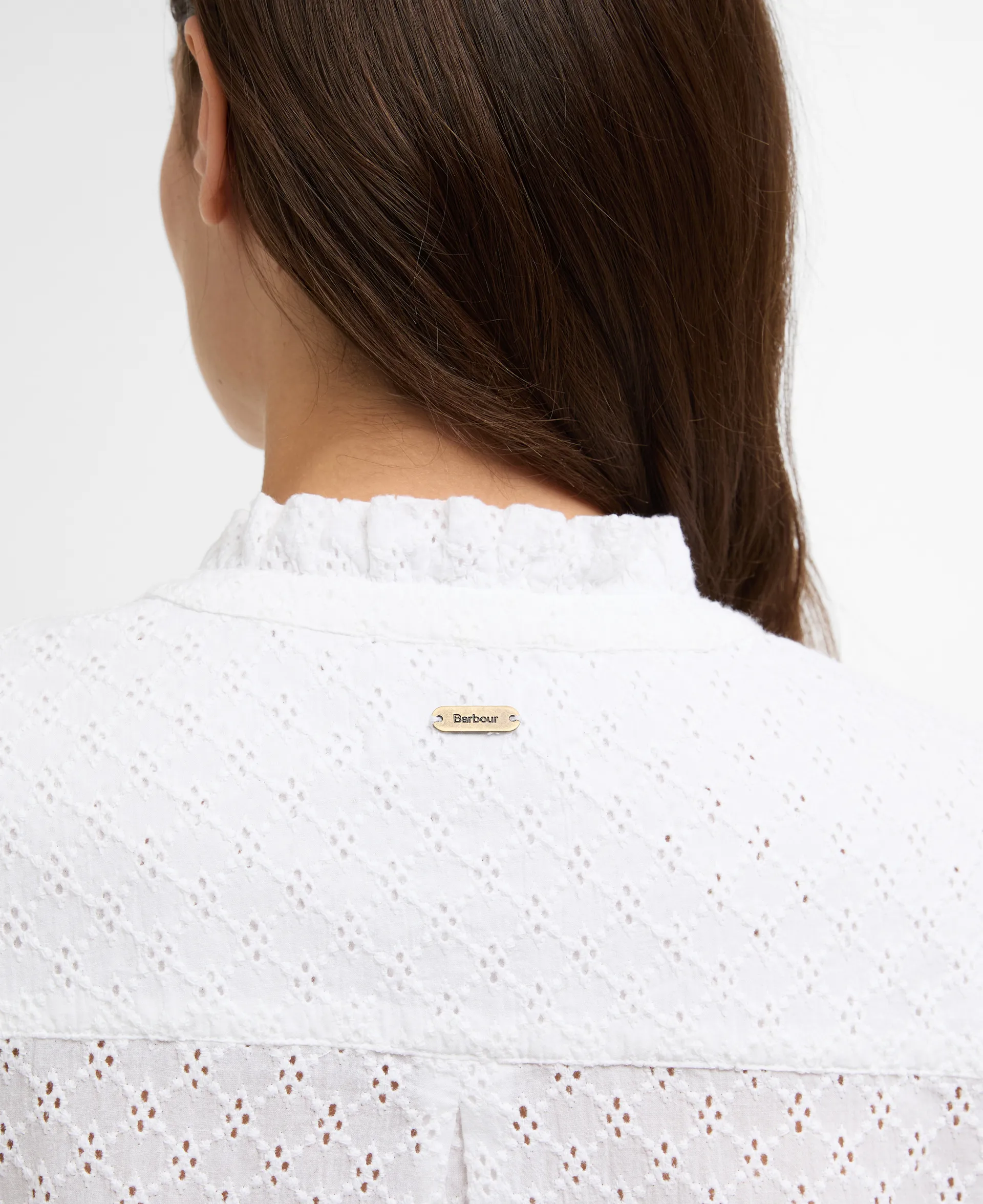 Relaxed cotton broderie ruffle neck shirt. Feature ruffles at cuff and neck, branded brass shank button at top neck with branded buttons at front placket and cuff. ID Bar to back neck.
