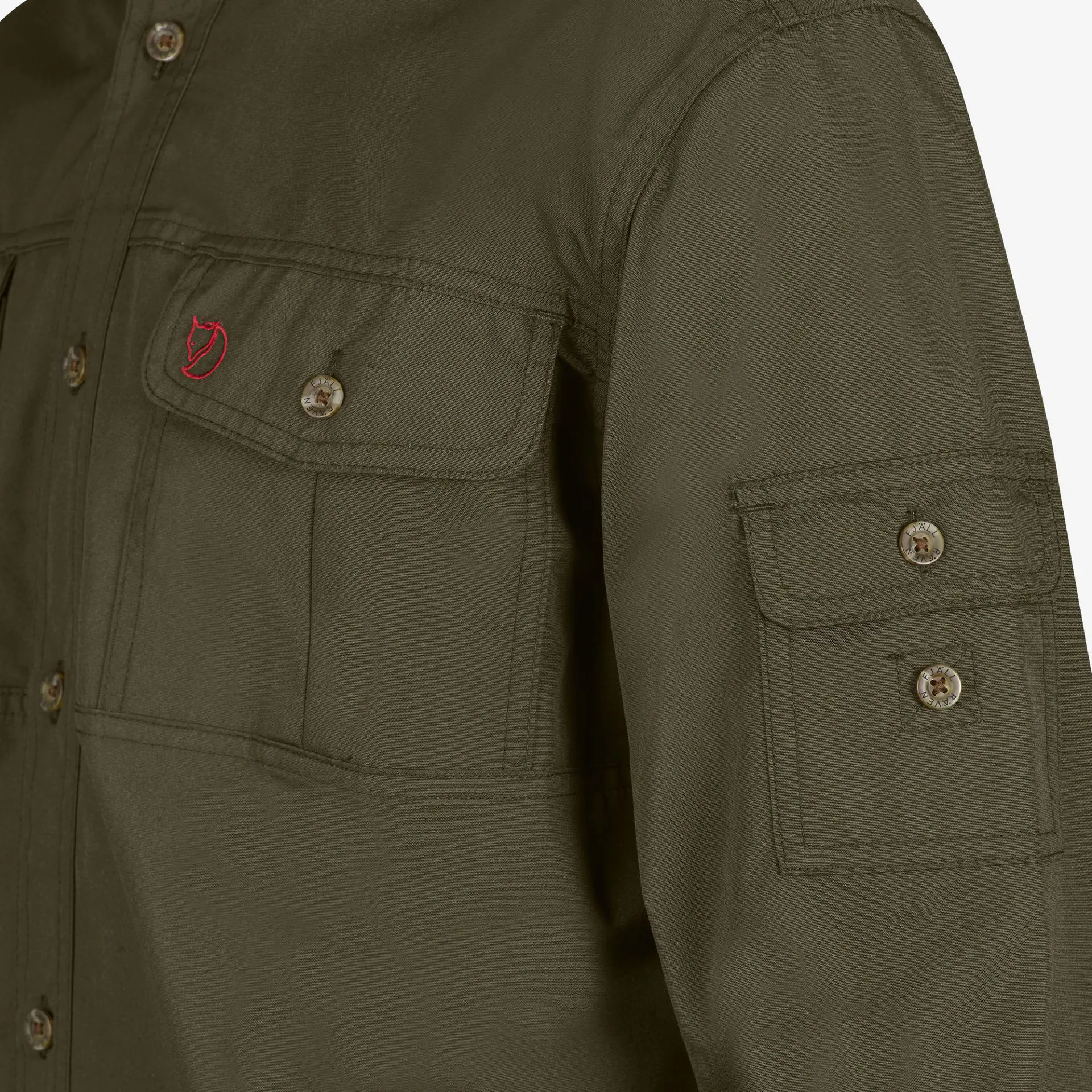 Two chest pockets and an arm pocket, all with buttoned flaps. Sleeve buttons keep rolled up sleeves in place.