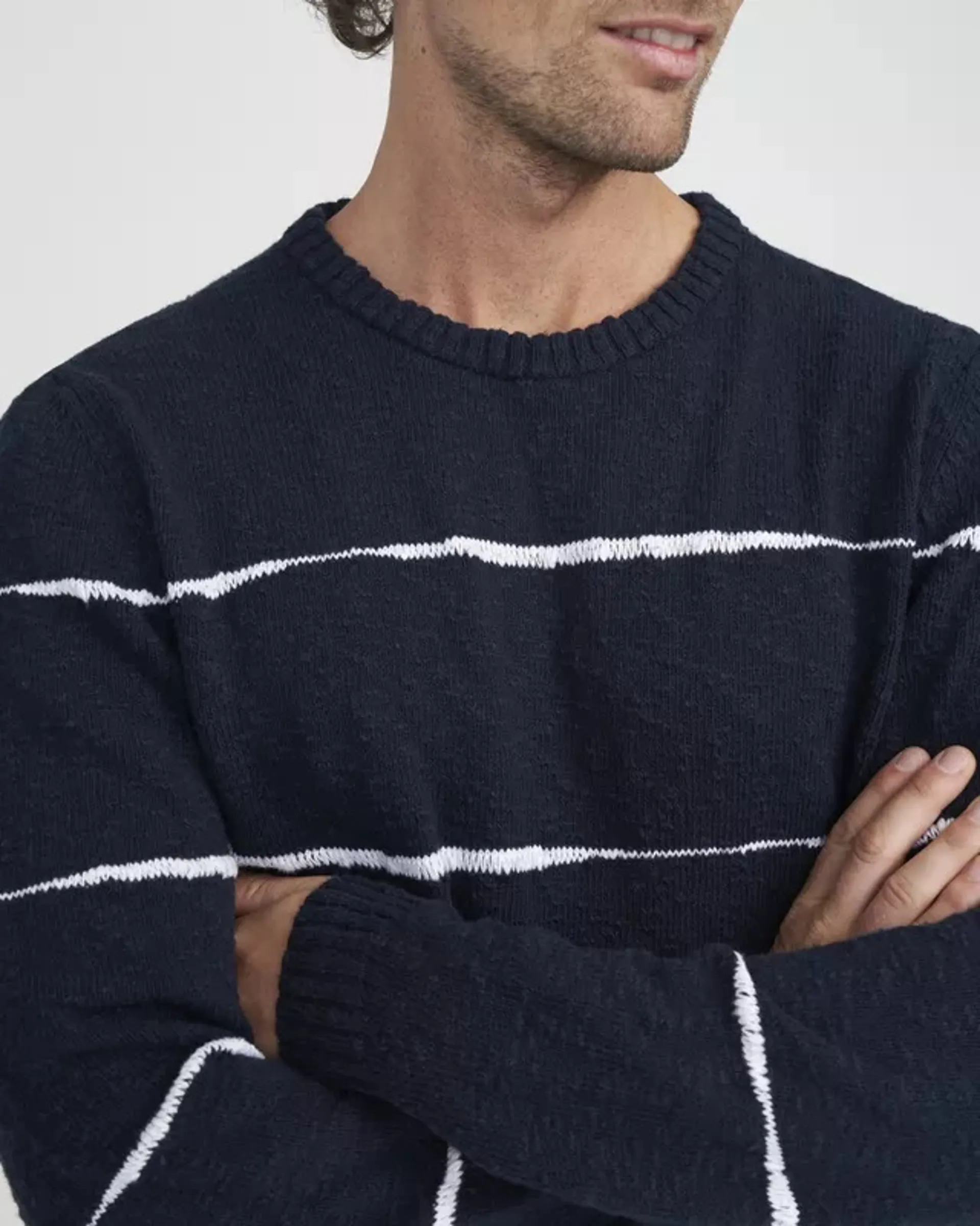 Knitted sweater with crew neck in our popular slub quality. Irregular stripes in contrast color which gives life to the garment.