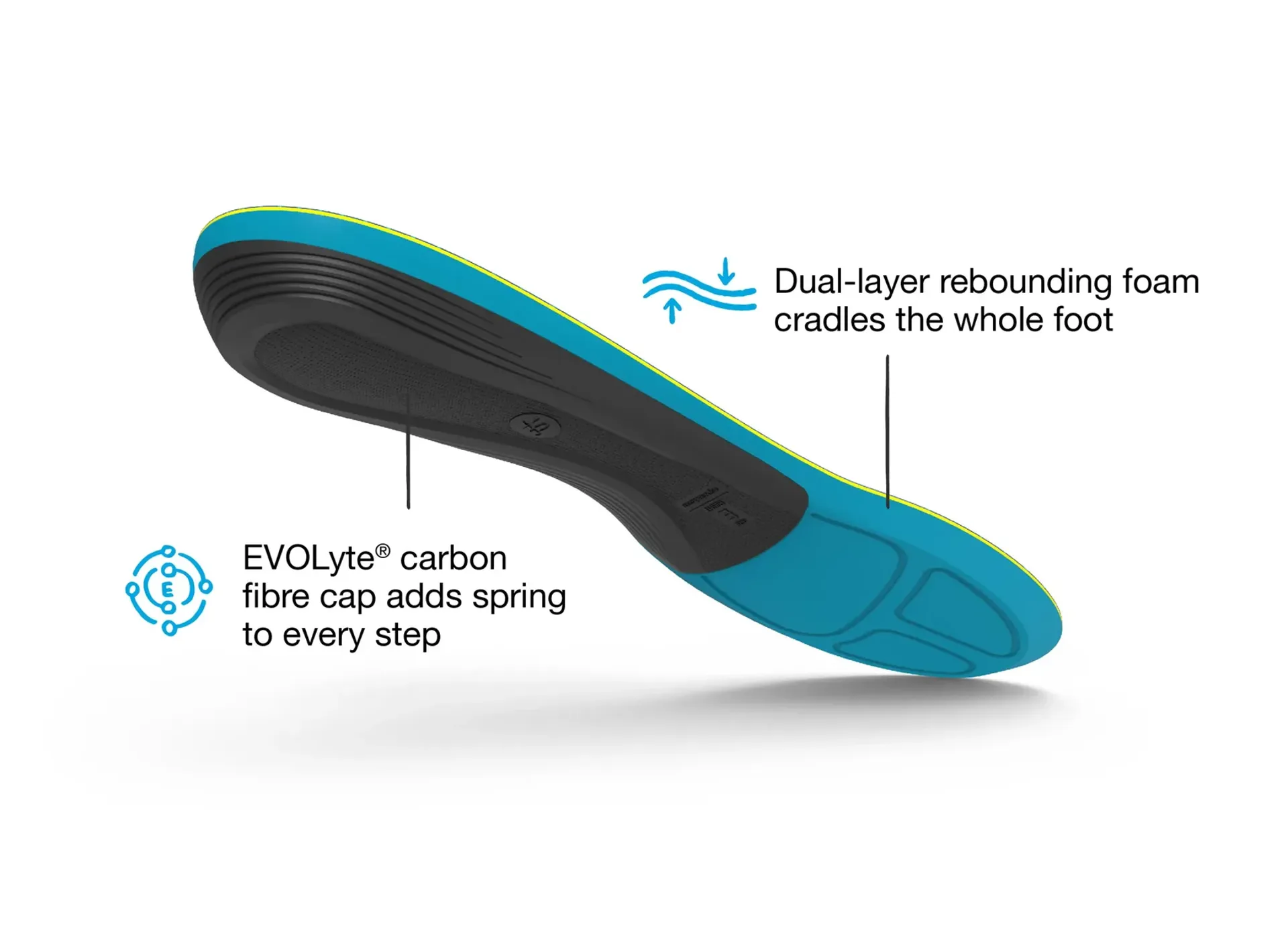 Medium arch signature Superfeet shape adds stability and comfort to your shoes, reducing stress on feet, ankles, knees, and back. Improves efficiency, reduces fatigue, and supports every step. Responsive EVOLyte® carbon fibre cap and two layers of Aerospring Rebound foam combine to deliver exceptional comfort and smooth and efficient energy transfer through your gait from foot strike to toe off. Made to replace the removable liner in roomy to moderate-fitting shoes.